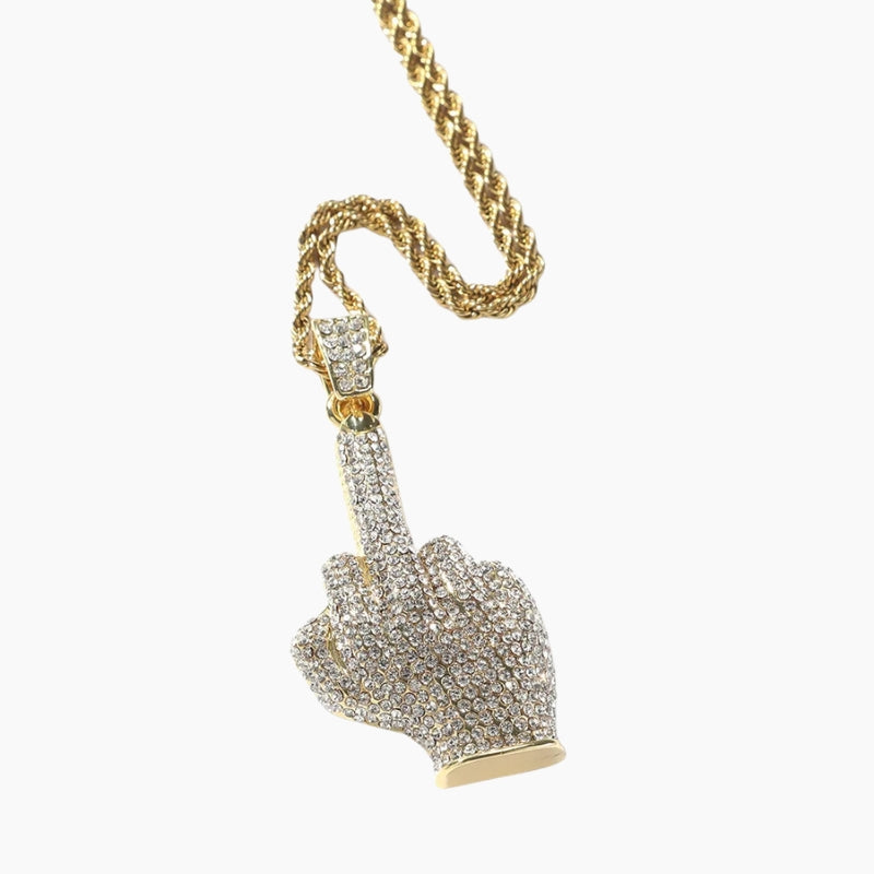 The VVS Style Iced Hand Gesture Pendant Chain features a bold hand symbol design fully iced with shimmering stones, inspired by hip-hop culture and Y2K aesthetics. The expressive hand gesture creates a strong visual statement, blending attitude, confidence, and streetwear influence. Paired with a solid chain, this pendant is designed to stand out in Y2K outfits, urban fashion, and statement-driven looks.